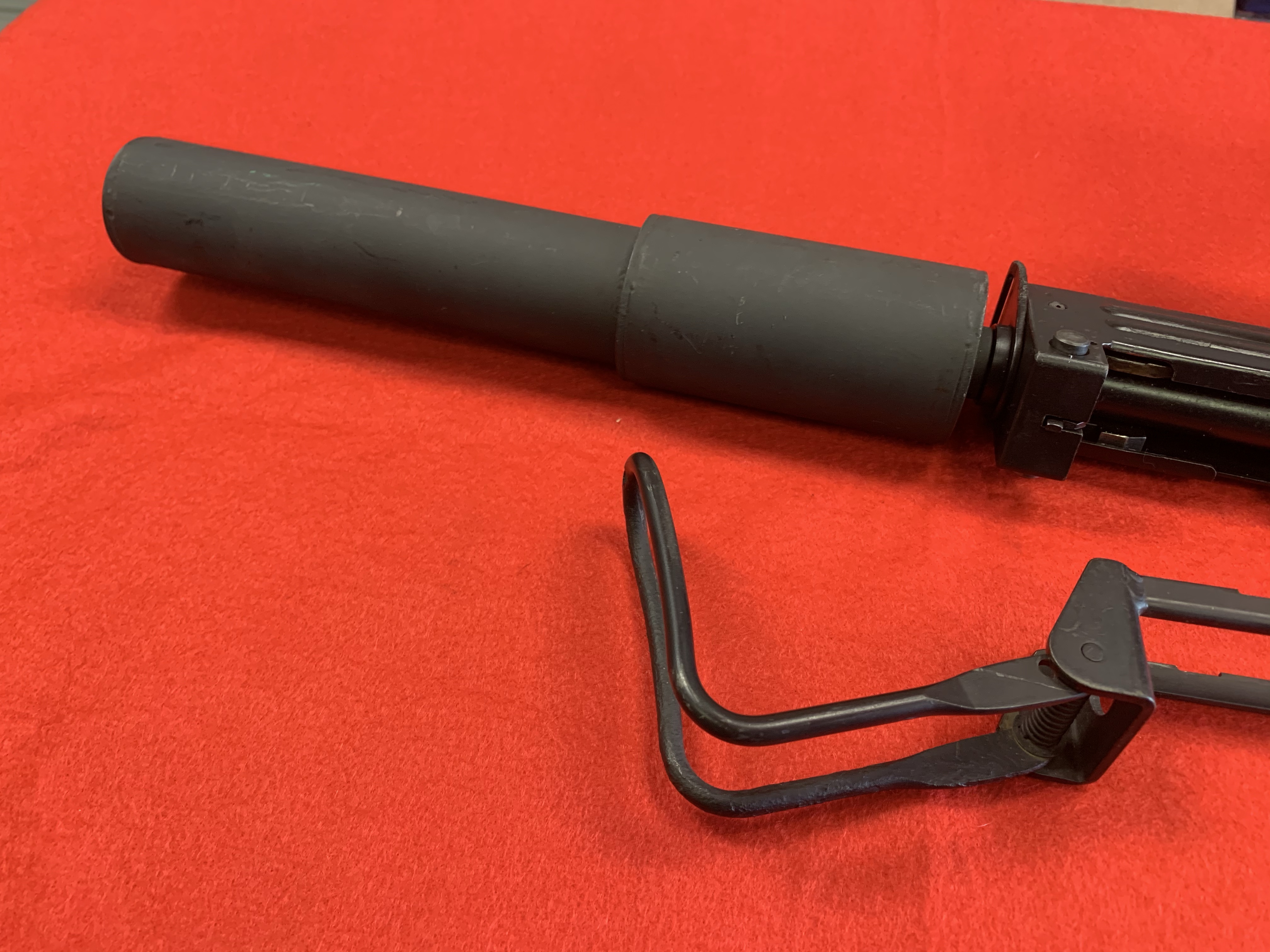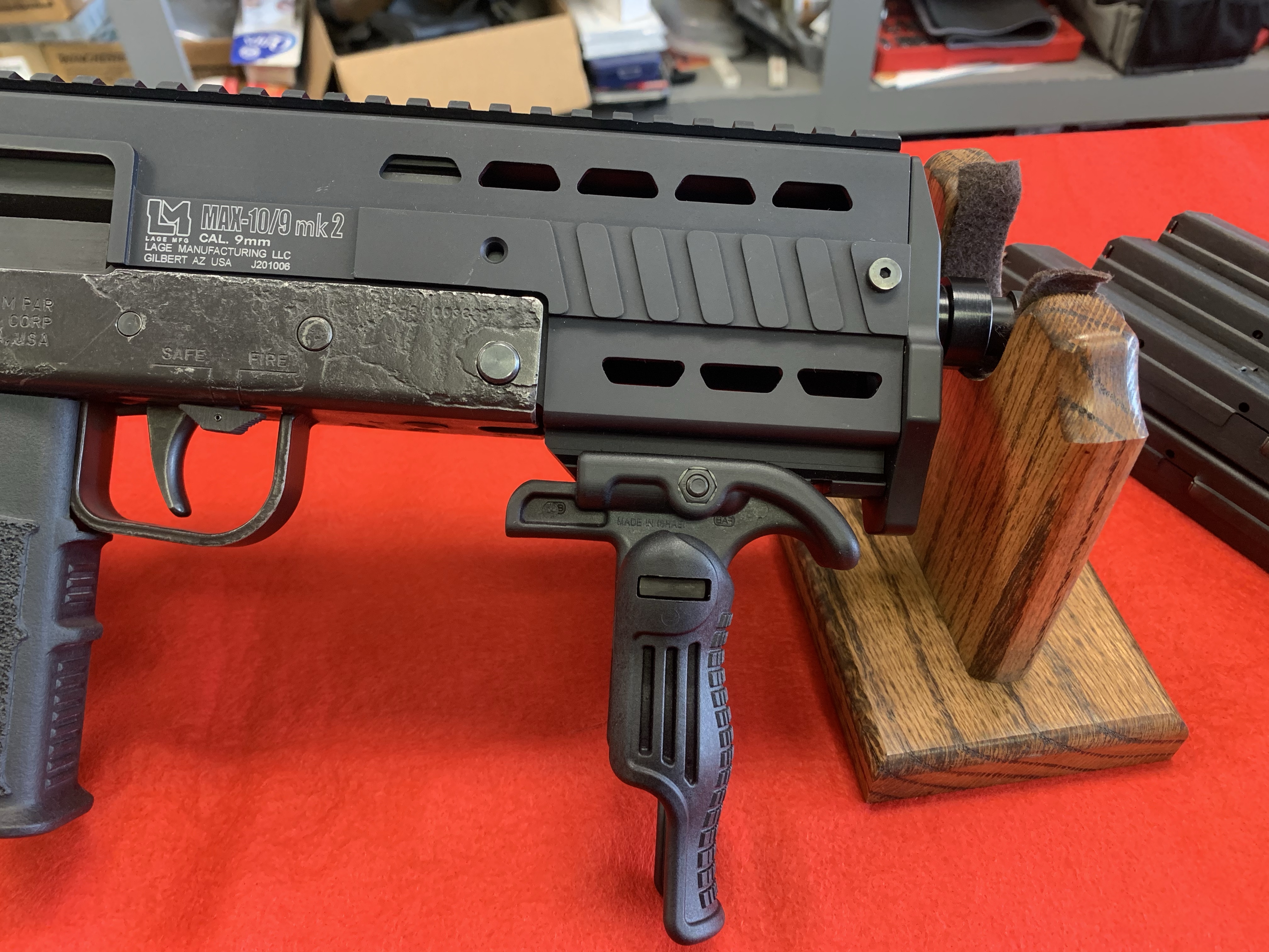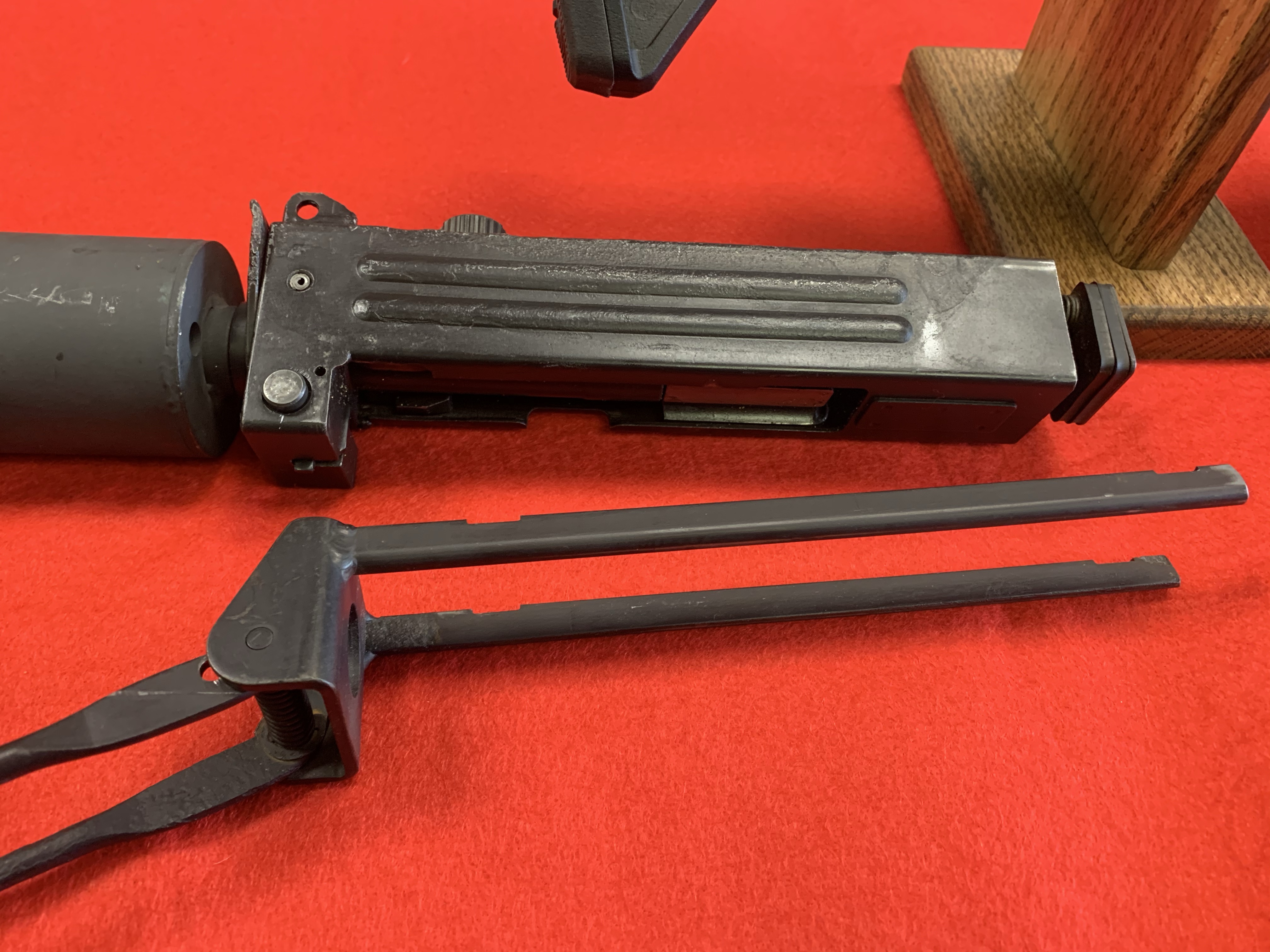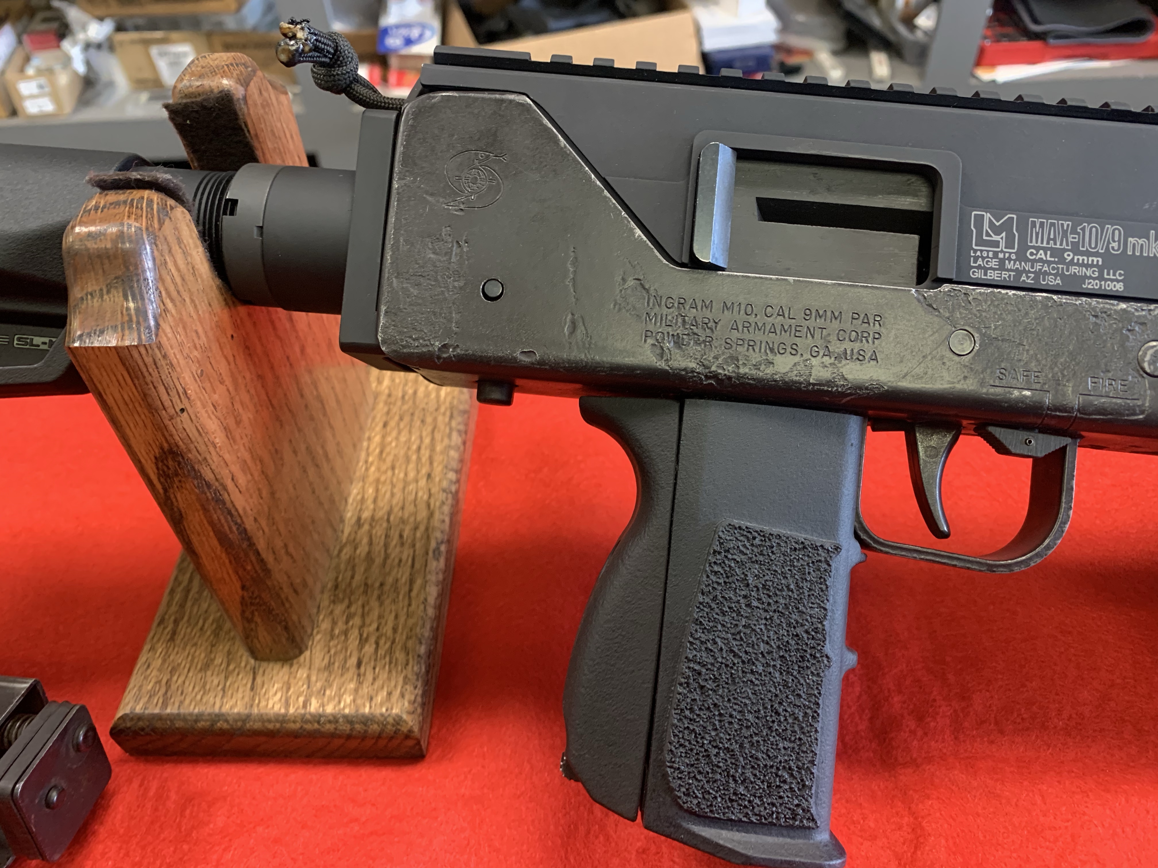 Package: 1972 Ingram 9mm M-10 with original upper/stock and faux silencer 9mm Lage MFG slow fire upper with a 1/2×28 tri-lug muzzle device Upgraded grip and stock 7 new production magazines for $7995. Gun without Lage and muzzle device $6995. On a form 3 and we will eFile. The lower is cosmetically water damaged. The previous owner had this stored in a floor safe, however their washer flooded the basement and they forgot to check on this gun. The exterior has very light pitting, but internally and mechanically this weapon is 100% fine. This weapon has been test fired. We have taken the condition into consideration with our pricing, and this bargain of a machine gun is a great way to enter the transferable machine gun market.