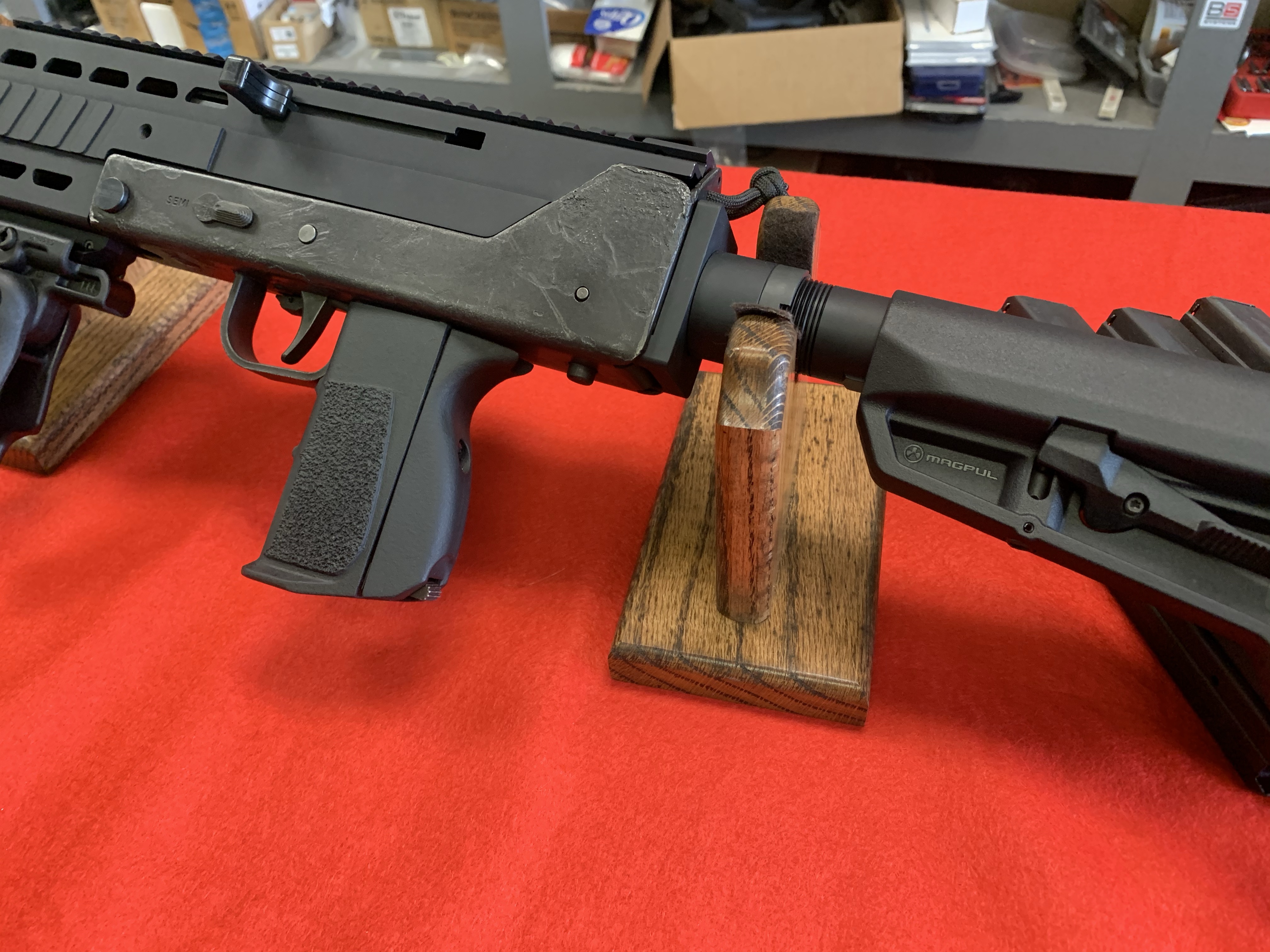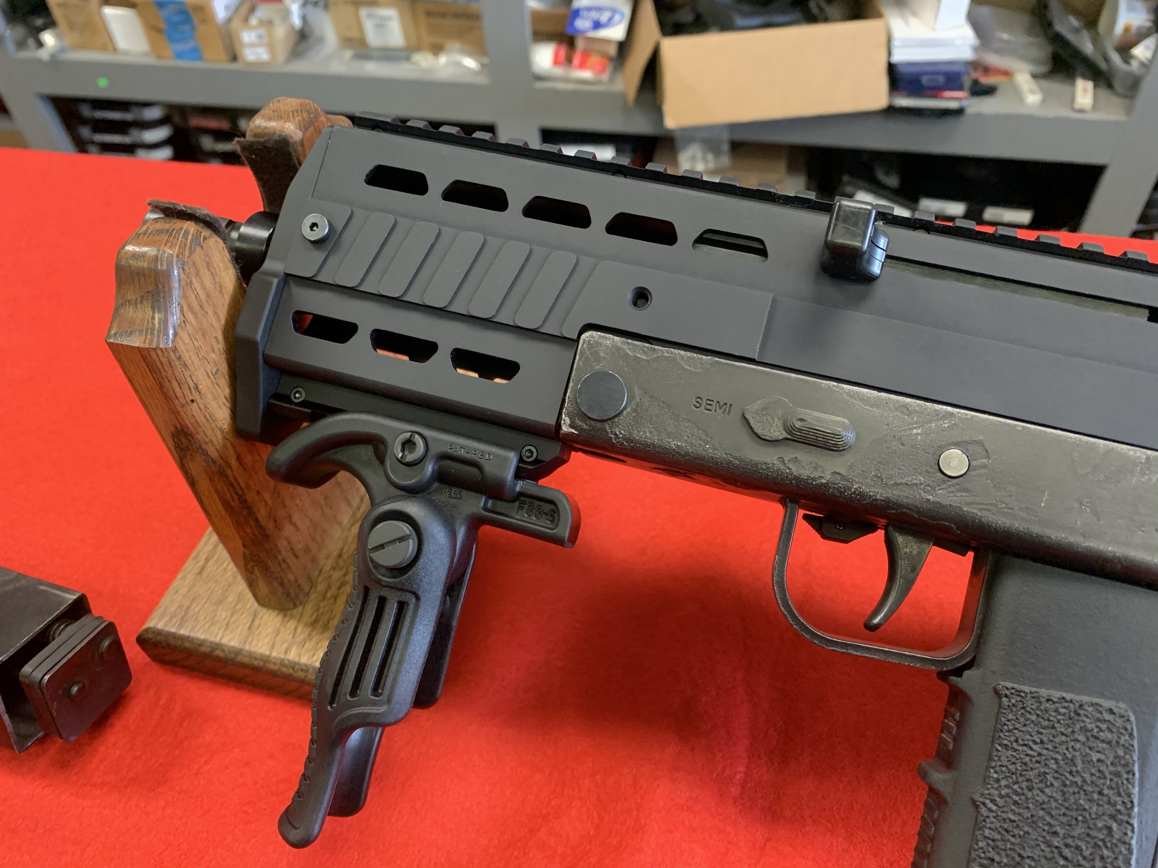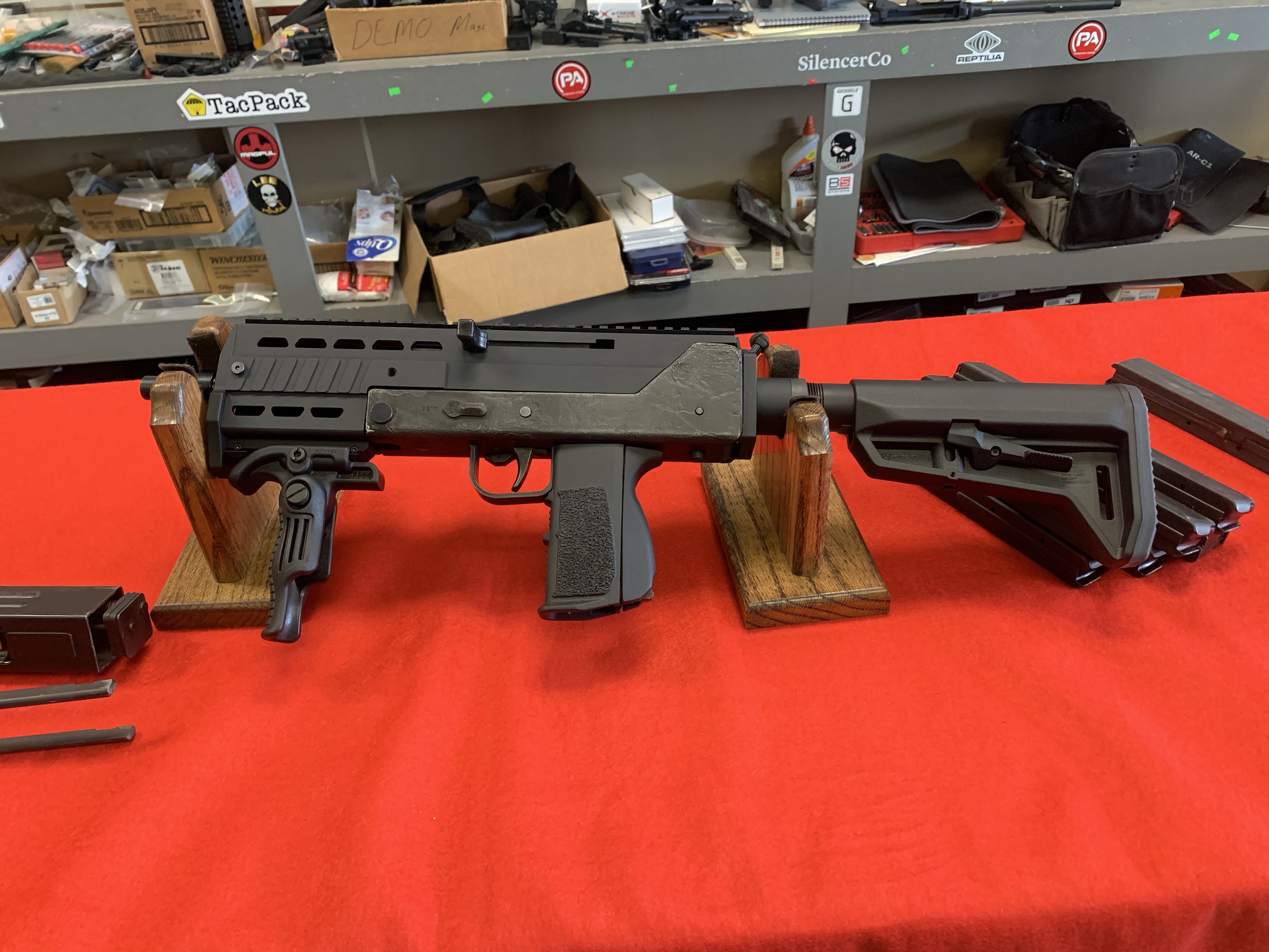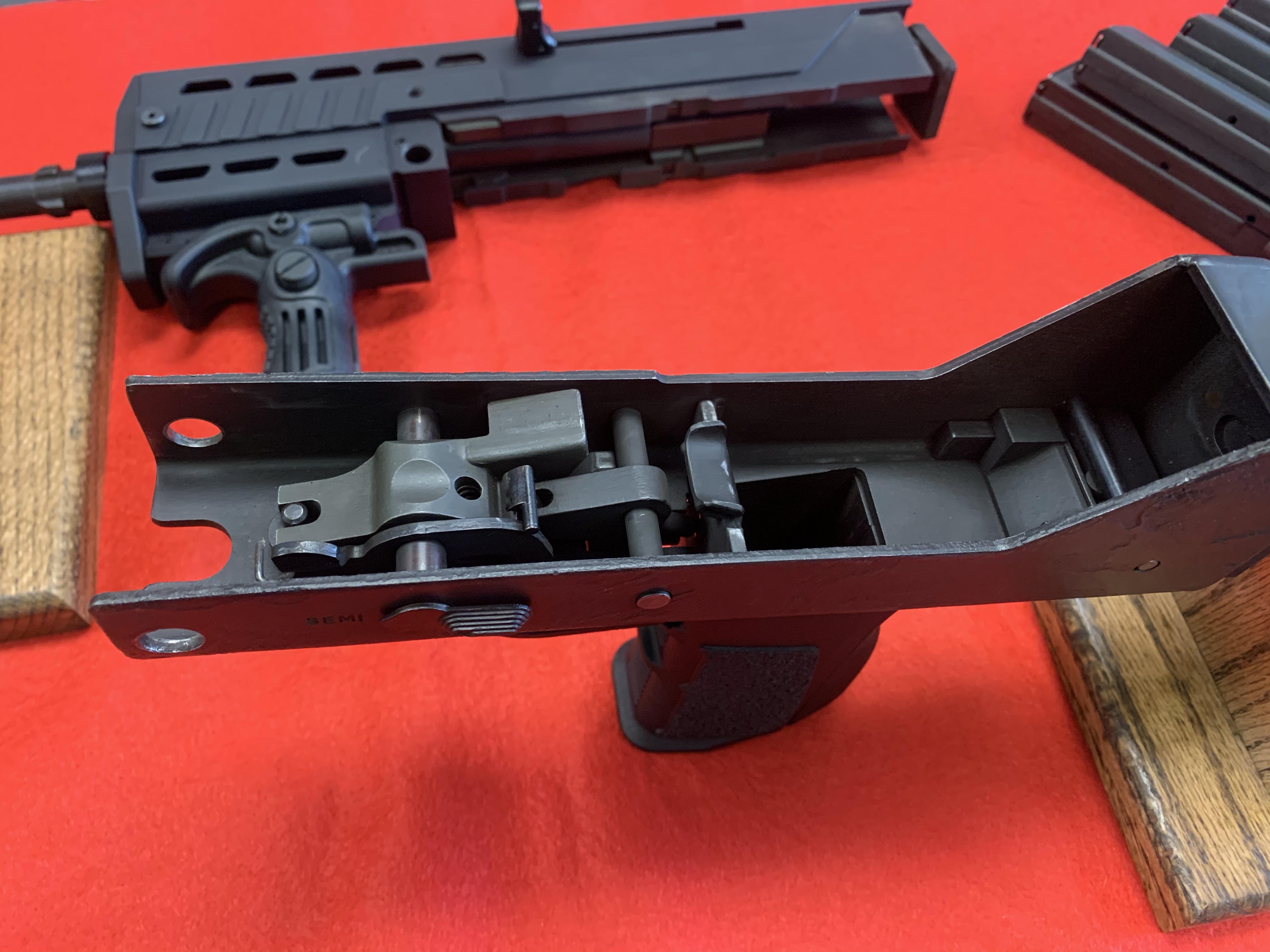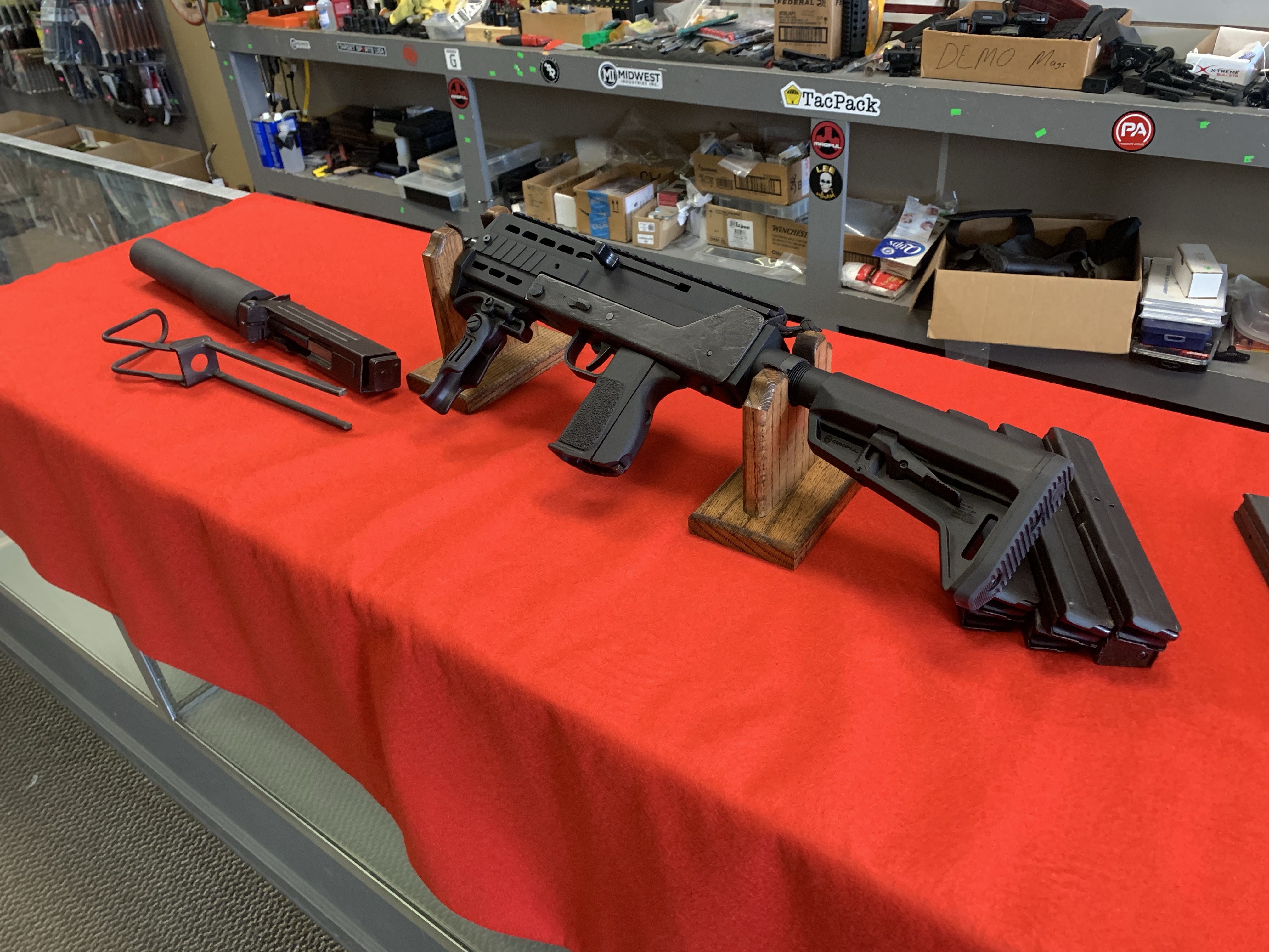 Package: 1972 Ingram 9mm M-10 with original upper/stock and faux silencer 9mm Lage MFG slow fire upper with a 1/2×28 tri-lug muzzle device Upgraded grip and stock 7 new production magazines for $7995. Gun without Lage and muzzle device $6995. On a form 3 and we will eFile. The lower is cosmetically water damaged. The previous owner had this stored in a floor safe, however their washer flooded the basement and they forgot to check on this gun. The exterior has very light pitting, but internally and mechanically this weapon is 100% fine. This weapon has been test fired. We have taken the condition into consideration with our pricing, and this bargain of a machine gun is a great way to enter the transferable machine gun market.